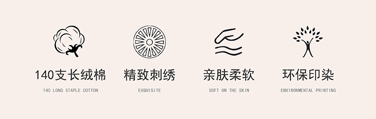 床單:245x270cm 被套:200x230cm 枕套:48x74cm 【面 料】新疆長絨棉 (140支長絨棉) 產品特點: 1. 面料選用140支新疆長絨棉,棉中奢品,高支高密,如蠶絲般絲滑,柔軟舒適; 2.精致繡花工藝,美觀時尚,充滿現代輕奢風; 3.活性印染,環保,色牢度高,不易褪色; 4.床單雙層圓角貼邊設計,品質。