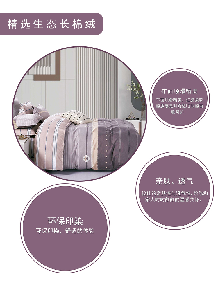 床單:230x230cm 枕套:50x80cm 【面 料】長(zhǎng)棉絨(聚酯纖維) 產(chǎn)品特點(diǎn): 1.親膚長(zhǎng)棉絨面料,柔軟舒適,不縮水,不變形; 2.活性印染,環(huán)保,不易褪色; 3.產(chǎn)品做工精細(xì),足尺足碼。