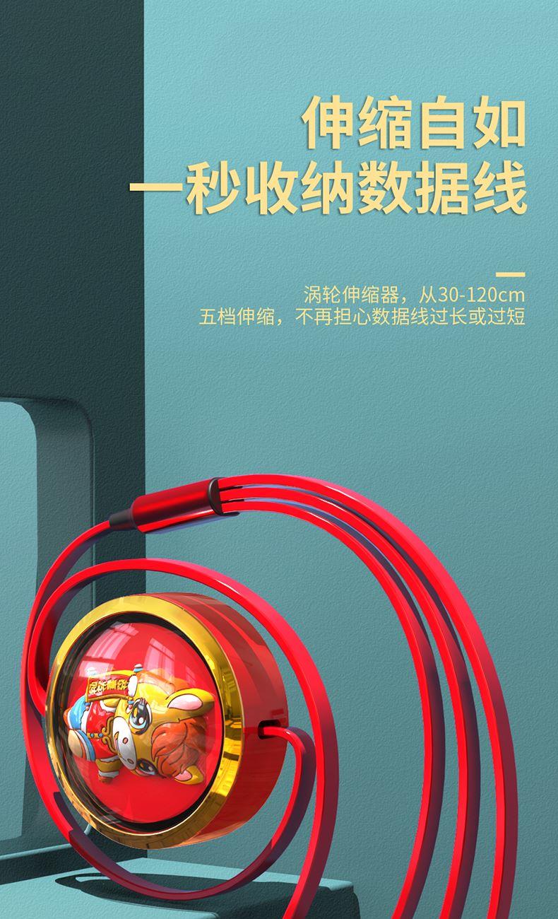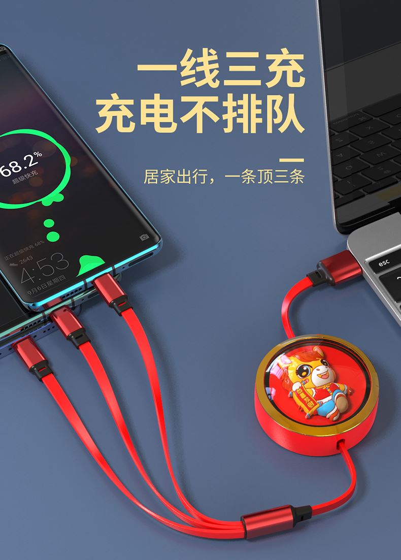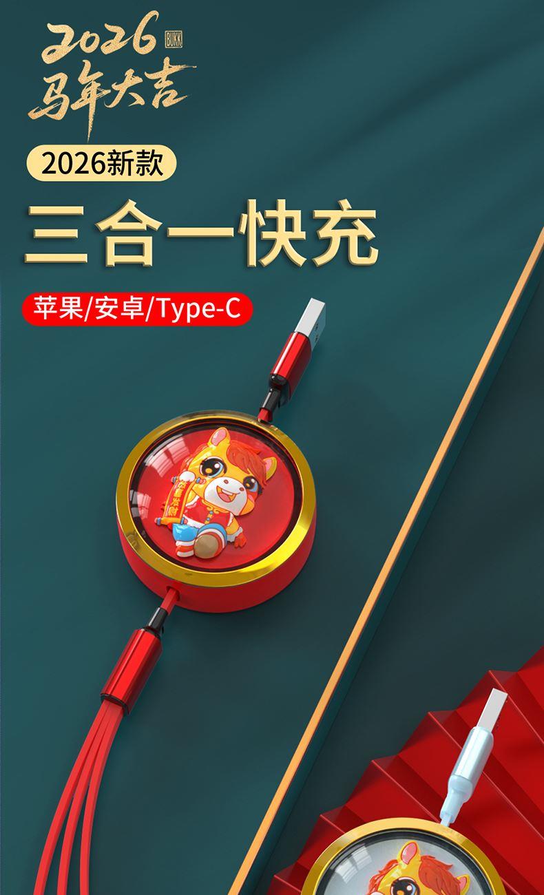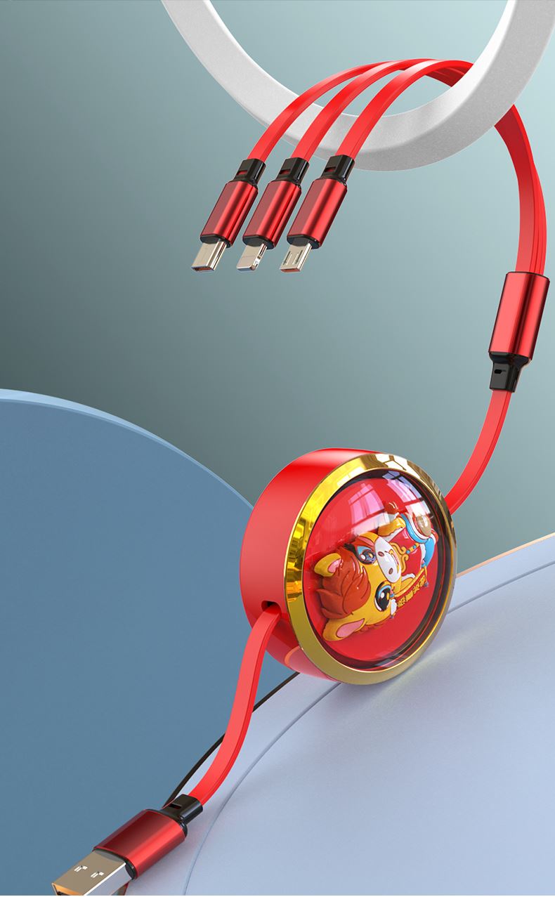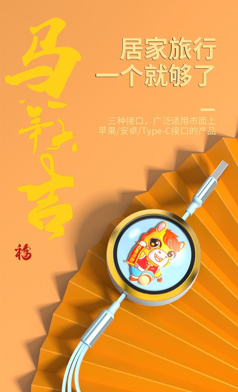 66W超級快充,充電更快 馬年元素造型,一體成型充電頭 三種接口滿足各種手機 1.2米長度設計,使用方便 編織線耐磨耐用,不易折斷