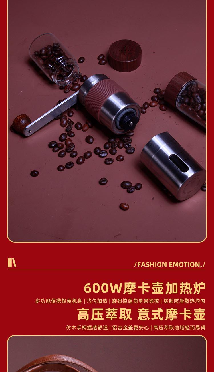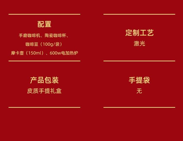 配置 手磨咖啡機*1 意式拼配咖啡豆*1袋(100克) 星空灰色摩卡壺*1 150毫升 約3杯 紅色咖啡杯*1說明書*1 600w摩卡壺加熱爐*1 尺寸6*14cm 皮質手提禮盒*1 材質 櫸木-黑瓷機芯-骨瓷--食品級硅膠- 尺寸 禮盒:247*346*100mm 企業定制-免費/場景呈現/贈送重要人士/私人贈送/隨手禮
