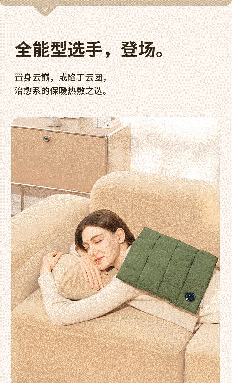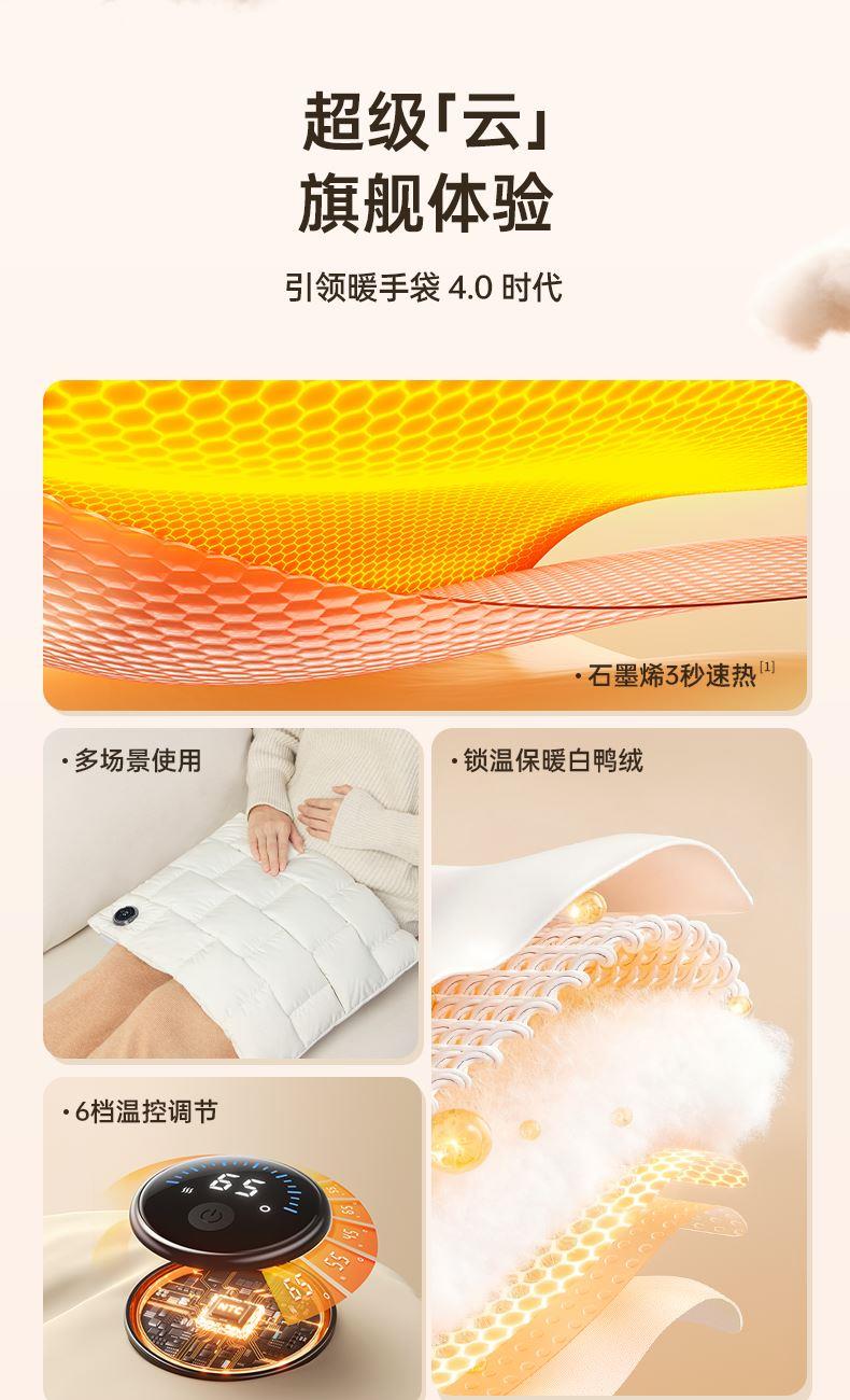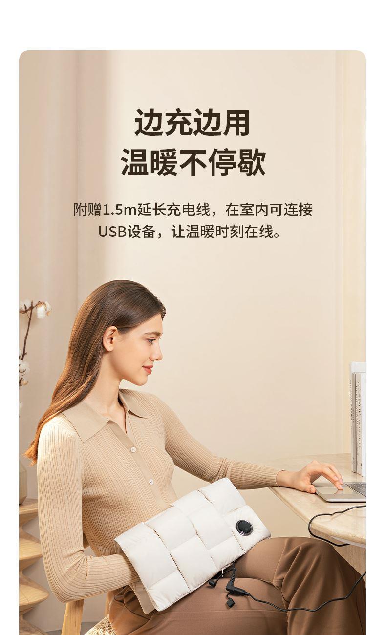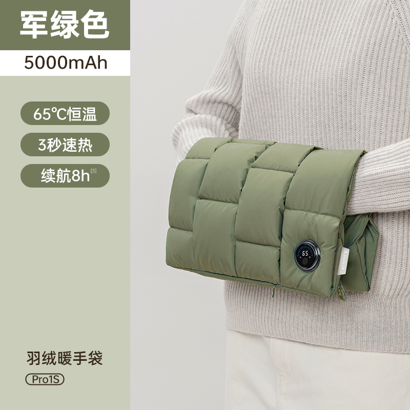 極速升溫,雙面發熱,含絨量90% 六檔調溫,智能數顯溫度,邊沖邊用不斷電 暖手/腰/腹/背多場景使用,可水洗清潔 產品材質:環保無味膚感PU皮+聚酯纖維+白鴨絨 產品顏色:米白、軍綠色 電池容量:5000mAh(DC版充電口)