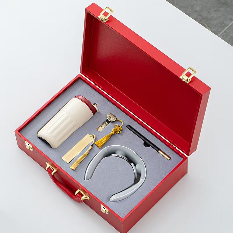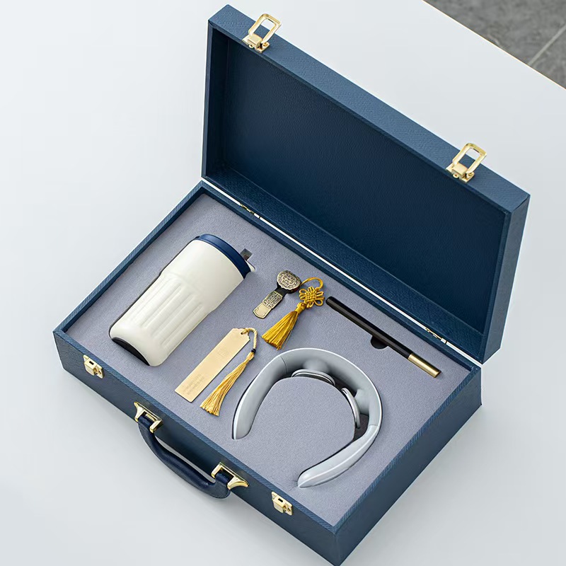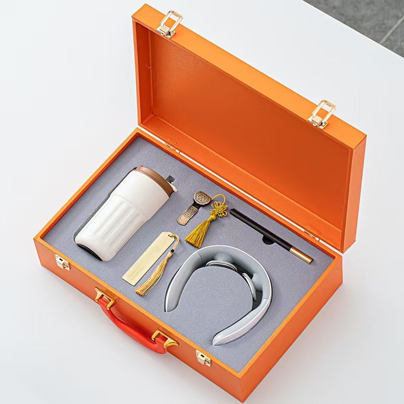配 制: 1筋膜槍/頸椎儀 溫顯杯 寫字筆 書簽 優盤 錦盒 規格:筋膜槍:17.4*14cm 溫顯咖啡杯 15*6.7cm 頸椎儀:300毫安 禮盒38.2*11cm 工藝:商務實用性禮品,上班族剛需產品。專業級筋膜槍,6檔變速,4種按摩頭,液晶觸屏,深度緩解肌肉酸脹。頸椎按摩儀,低頻脈沖技術,緩解頸椎疼痛。溫顯咖啡杯,智能溫顯,長效保溫保冷,可拎可握。