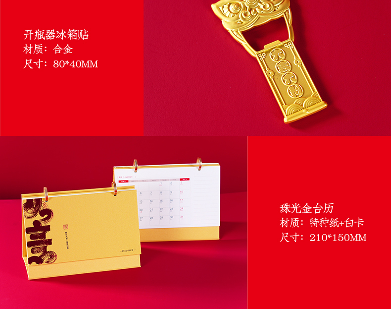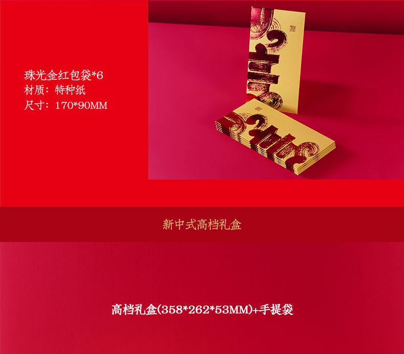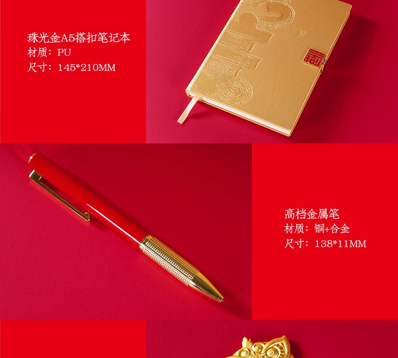 配置:筆記本+簽字筆+臺(tái)歷+紅包袋*6 材質(zhì):珠光金紙+白卡+合金+珠光皮 尺寸:筆記本145*210mm 臺(tái)歷210*150mm 簽字筆138*11mm 紅包袋170*90mm 包裝:珠光金禮盒(358*262*53mm)+手提袋