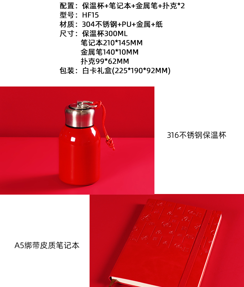 配置:保溫杯+筆記本+金屬筆+撲克*2 型號:NF15 材質:304不銹鋼+PU+金屬+紙 尺寸:保溫杯300mL 筆記本210*145mm 金屬筆140*10mm 撲克99*62mm 包裝:白卡禮盒(225*190*92mm)