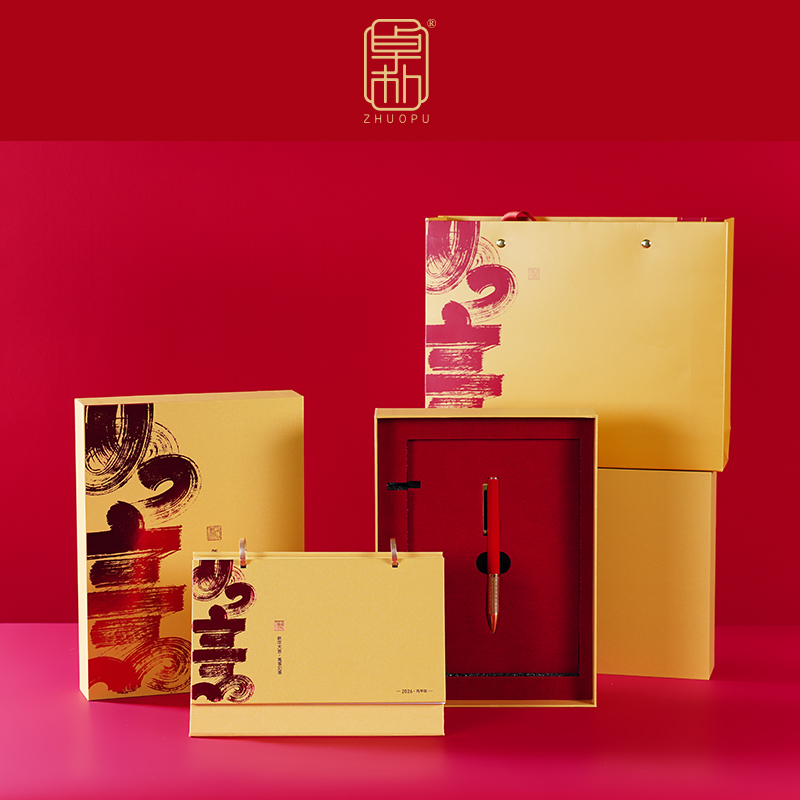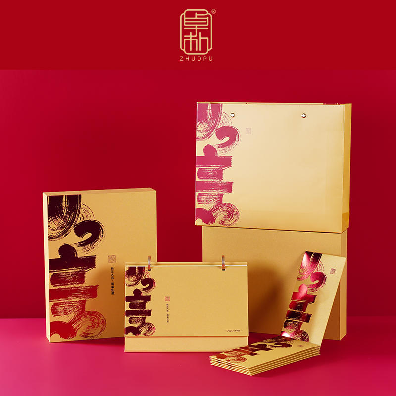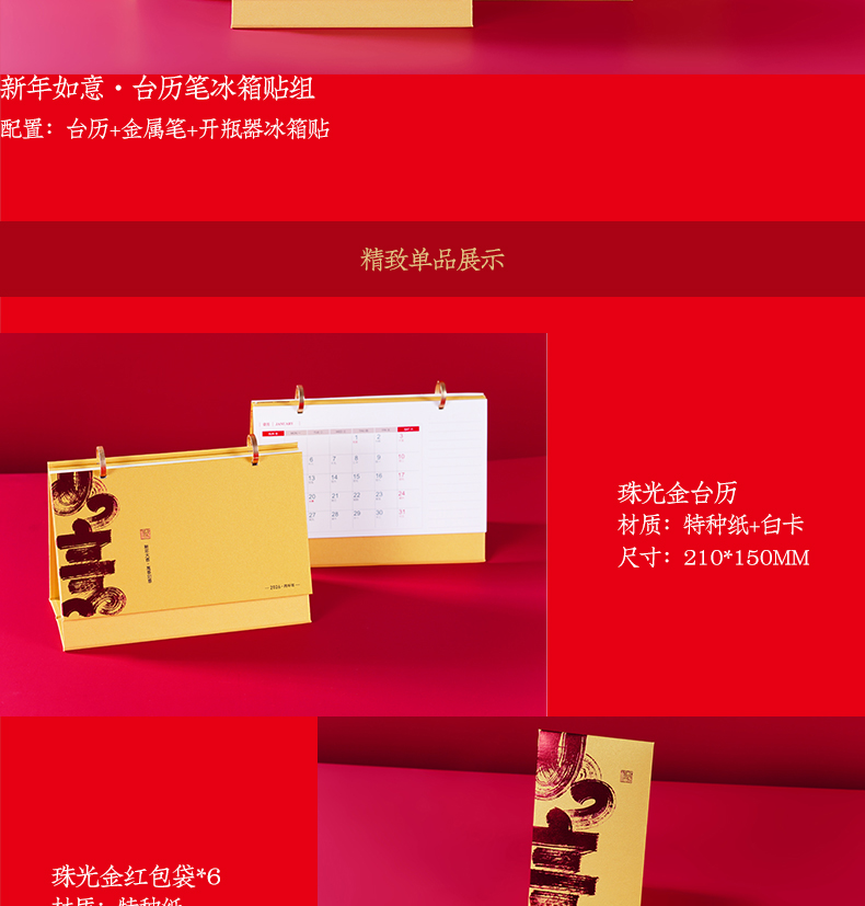 配置:臺歷+紅包袋*6 材質:珠光金紙+合金+白卡 尺寸:臺歷210*150mm 紅包袋170*90mm 包裝:珠光金禮盒(260*195*50mm)+手提袋