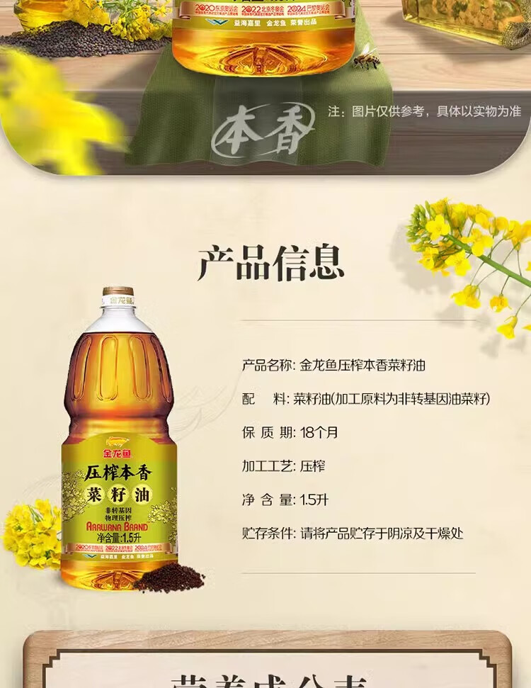 【金龍魚菜籽油油】精選好菜籽,小瓶鮮用不浪費,烹飪營養之選!
