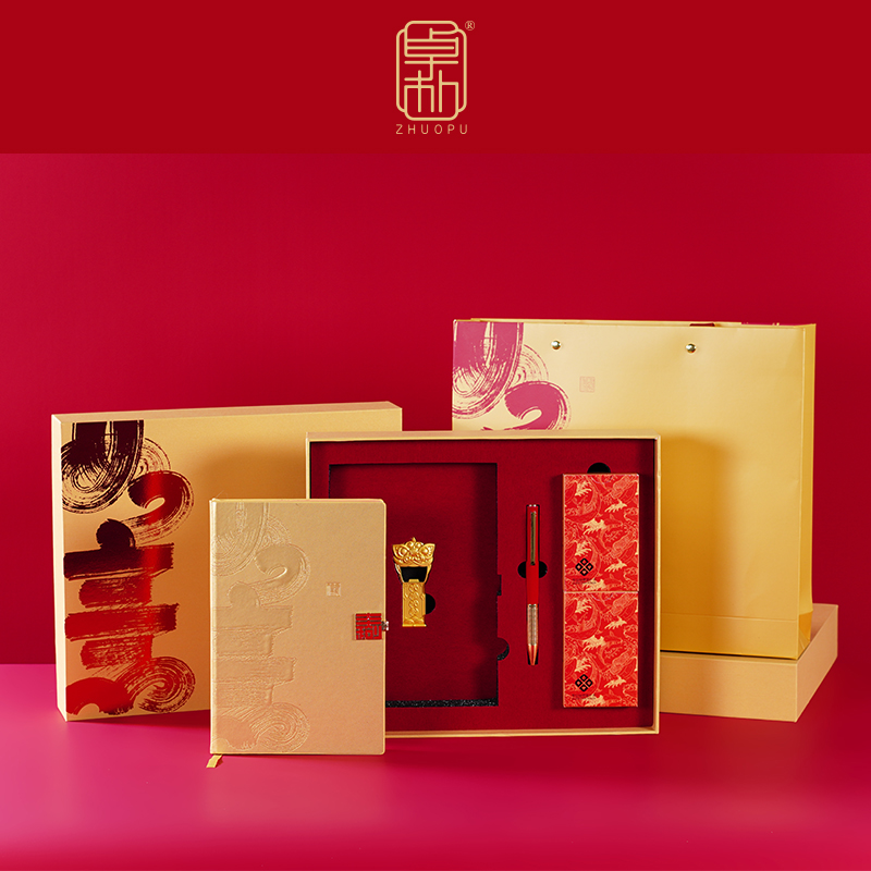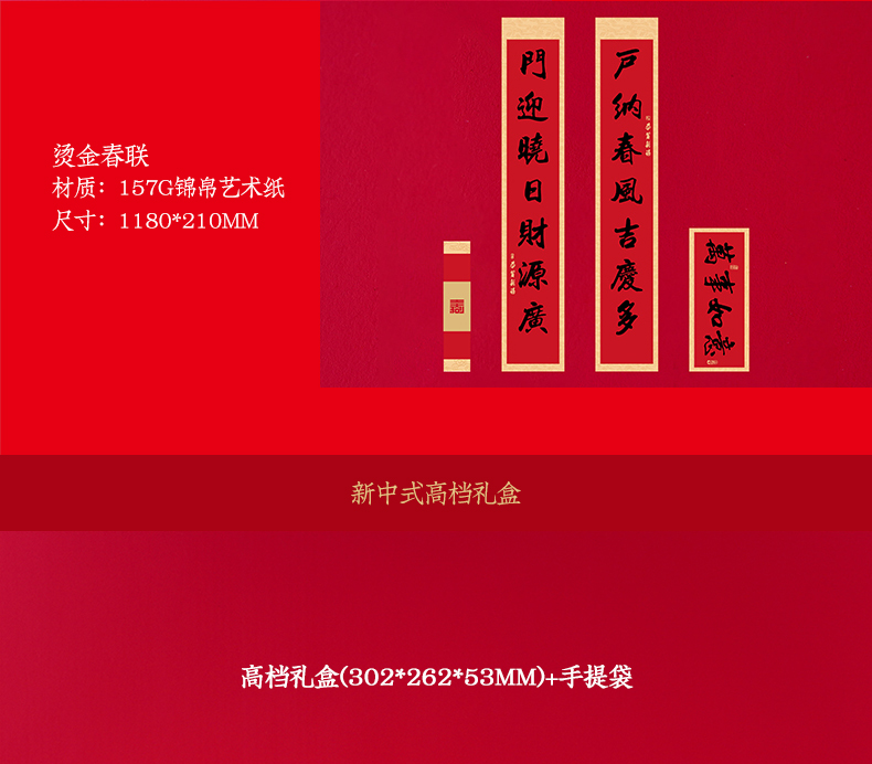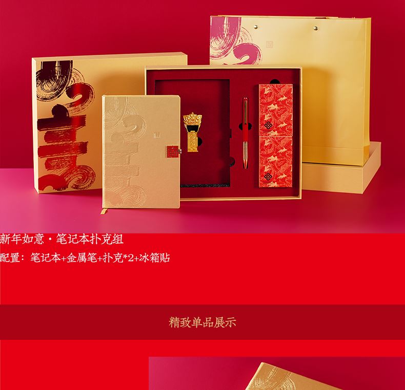 配置:筆記本+筆+春聯(lián)+冰箱貼 材質(zhì):珠光金紙+白卡+合金+珠光皮 尺寸:筆記本145*210mm 簽字筆138*11mm 春聯(lián)1180*210mm 冰箱貼80*40mm 包裝:珠光金禮盒(358*262*53mm)+手提袋