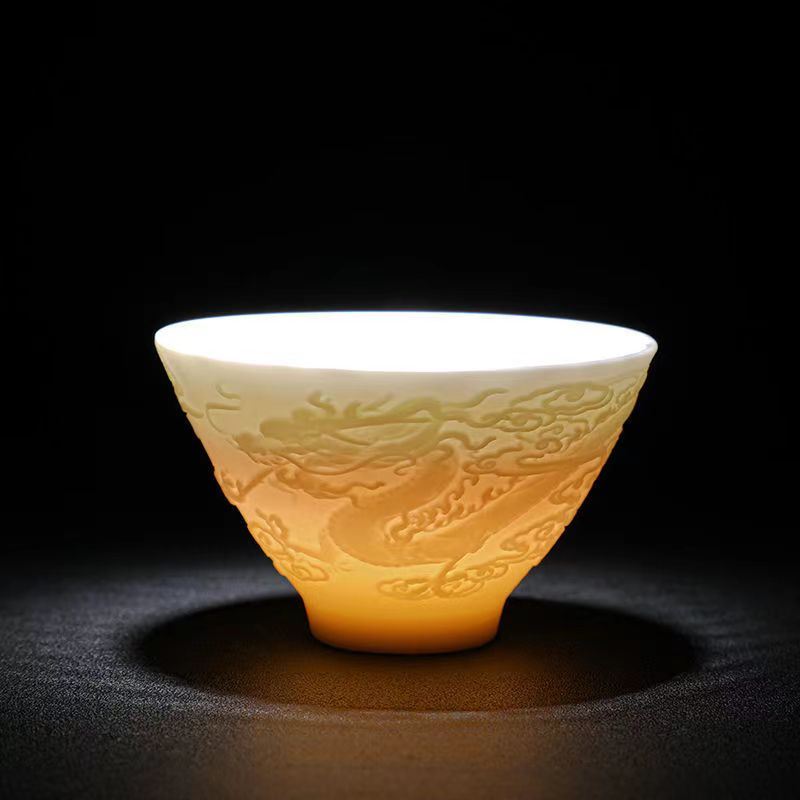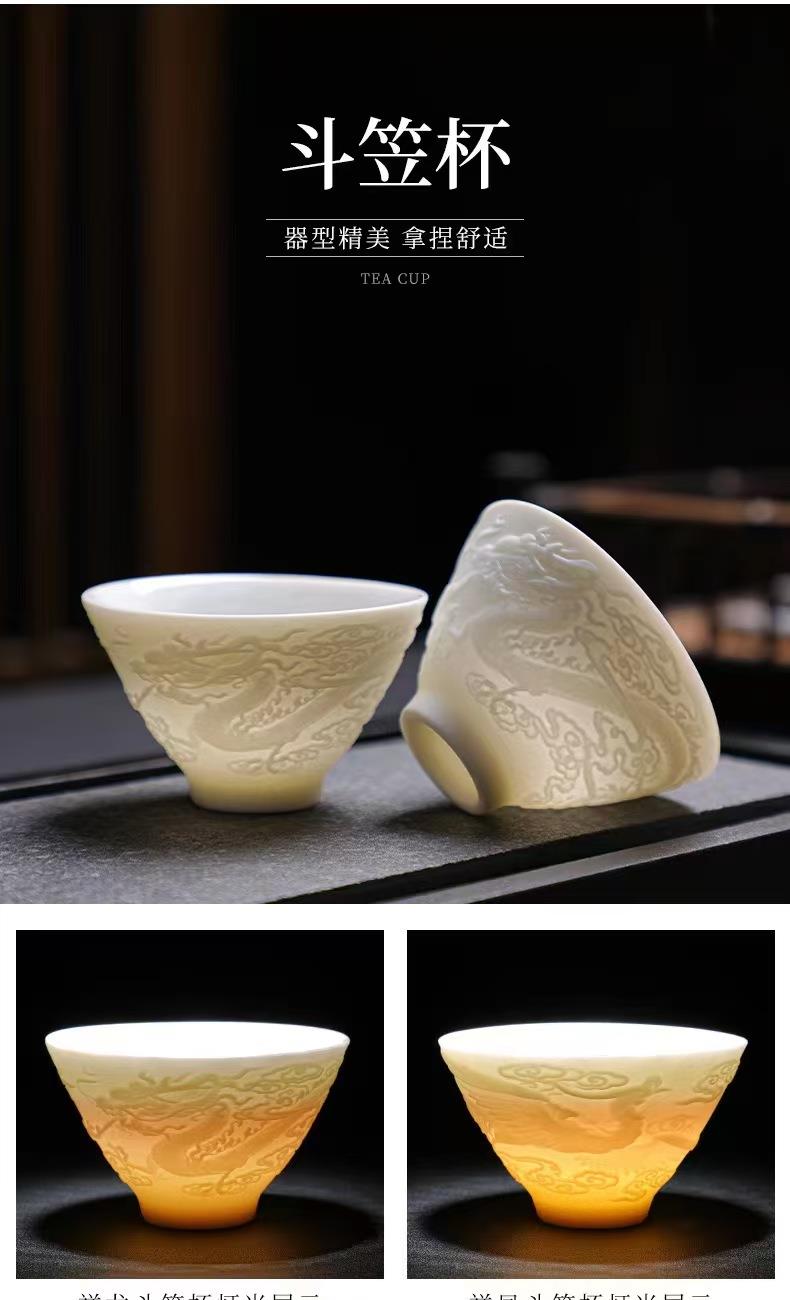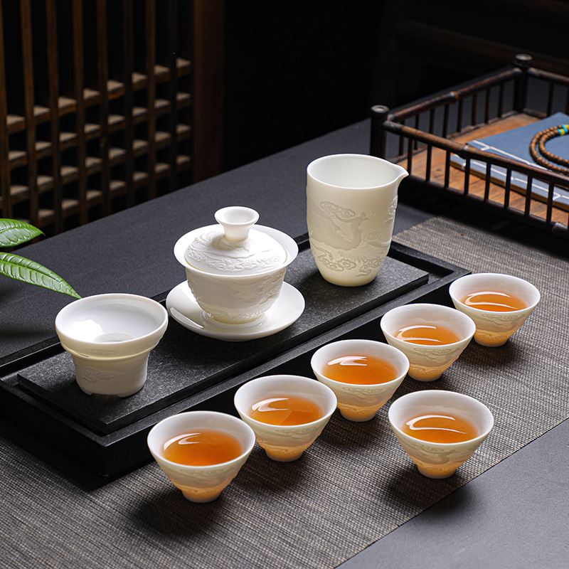 配制:1壺 6杯 1公道杯1茶托1茶漏1茶巾茶夾 1茶盤 1旅行包 規格: 蓋碗:10.5*9.5cm 茶杯:6.5*5cm 公道杯:9.5*8.5cm 茶托茶漏:8*5cm 茶盤:33*19*3.5cm 推薦說明:手工浮雕龍鳳紋茶具,栩栩如生。羊脂玉瓷,瓷質細膩溫潤,觸感舒適。似凝脂,如美玉。在陽光照射下,呈半透明羊油狀,潔白滋潤,故稱羊脂玉。錦盒裝,時尚精致上檔次。