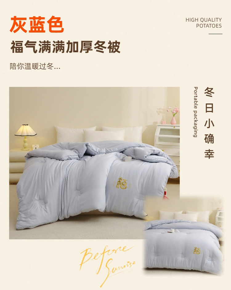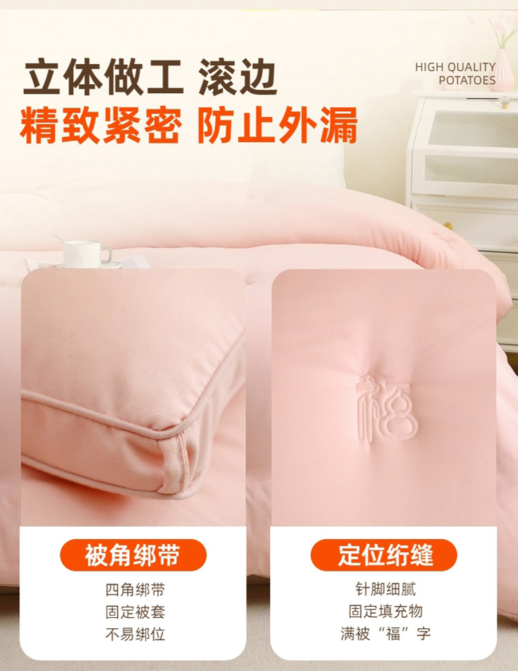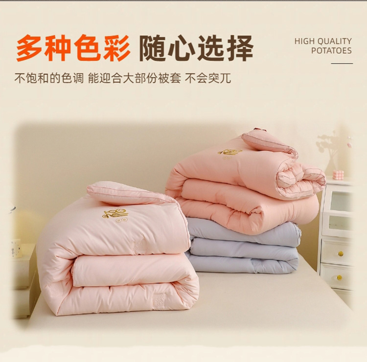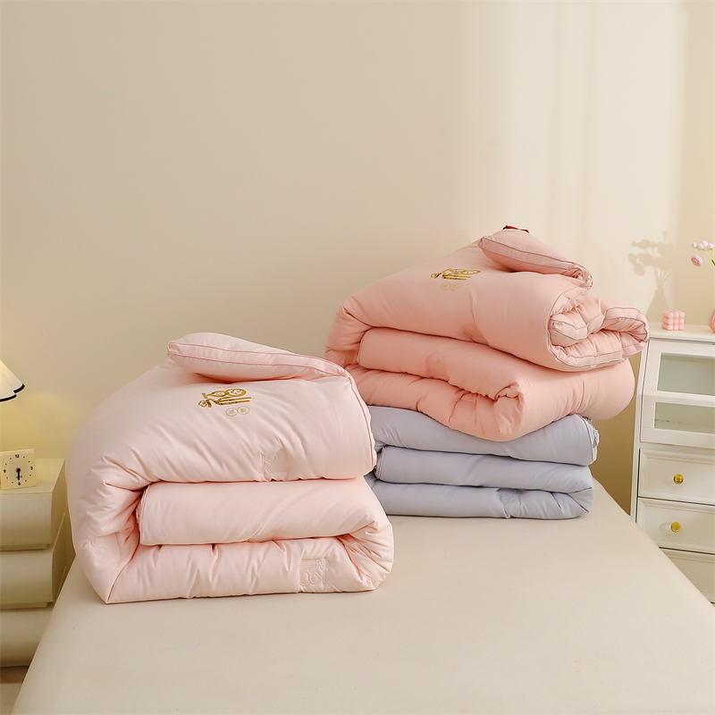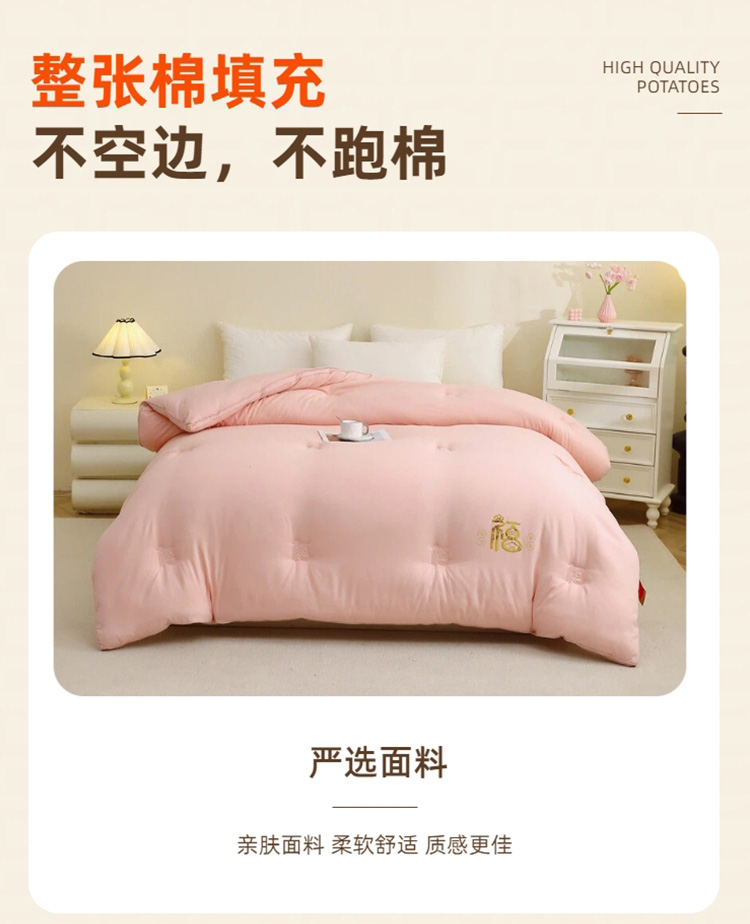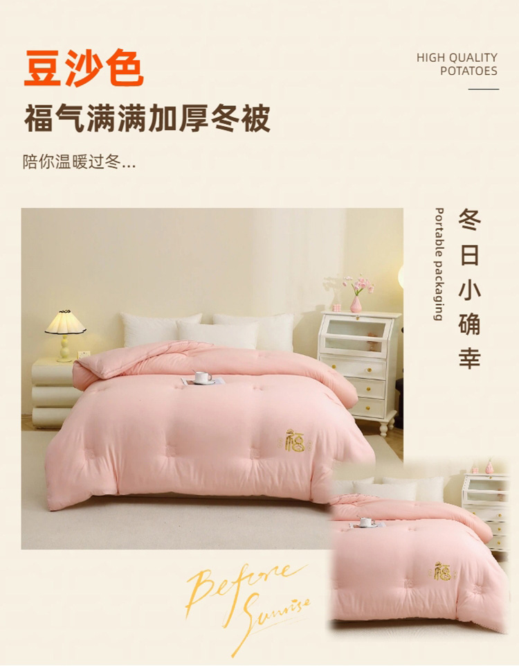 規格:200X230cm(10斤) 面料:聚酯纖維 填充:聚酯纖維 花色:灰色、豆沙、粉 一針到底的絎縫工藝,針腳小,針距短,針腳細膩牢固,不易脫線更耐用。蓬松保暖,填充均勻,良好的定型效果,回彈性好。吸濕透氣性能佳 。