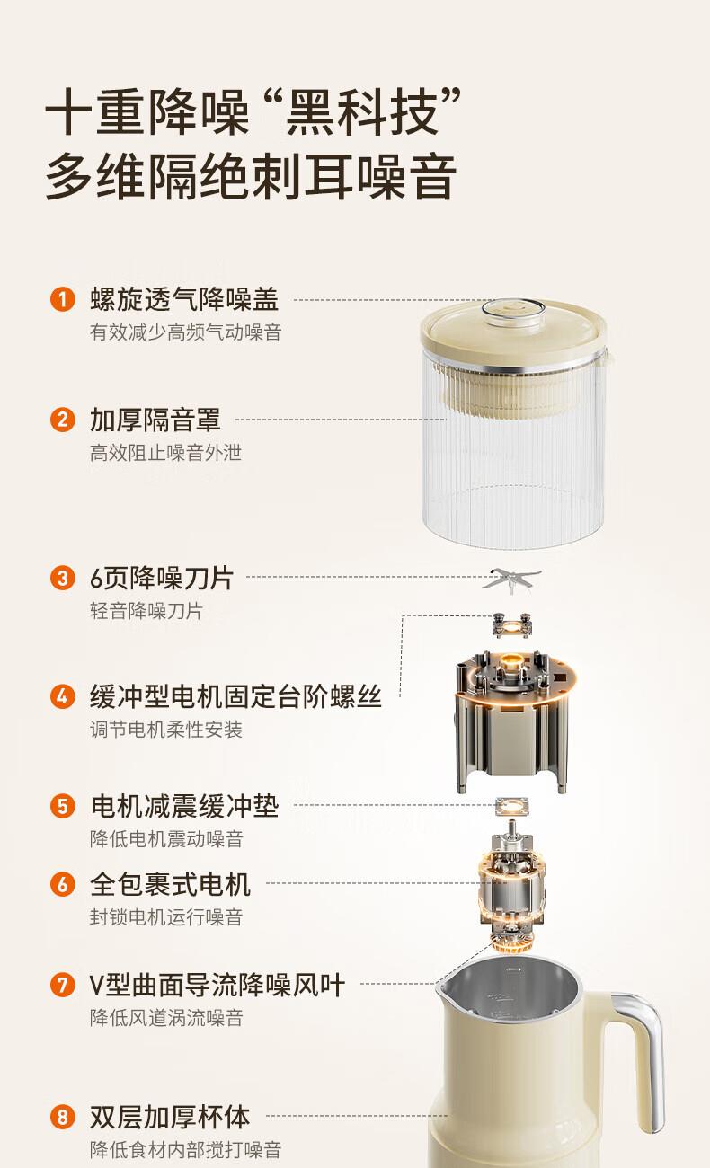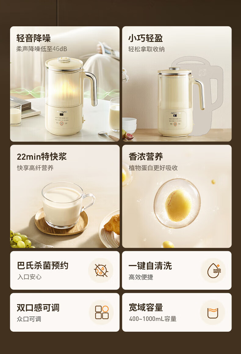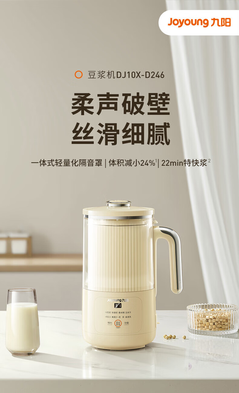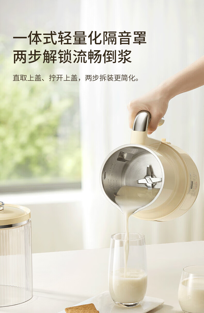 噪音低至45dB; 小巧不占地,簡易好拆裝; 22min特快漿; 細(xì)膩免濾,營養(yǎng)香濃; 雙口感可調(diào) 容量:1000mL 單臺包裝尺寸:245L*245W*400Hmm