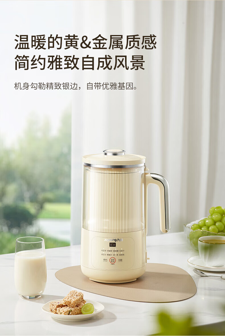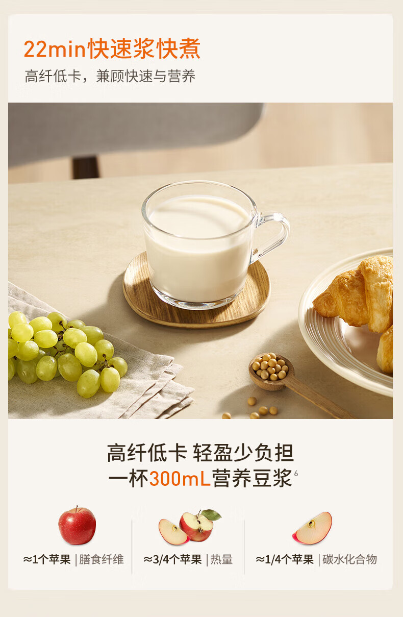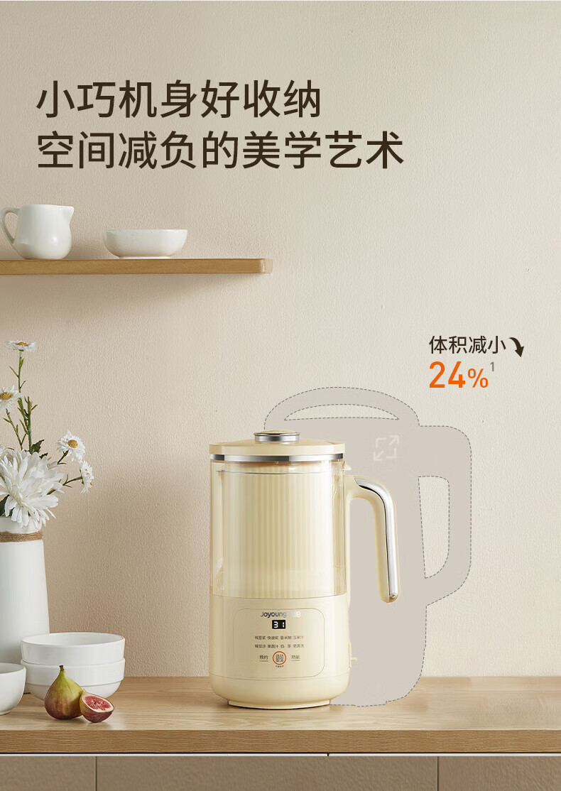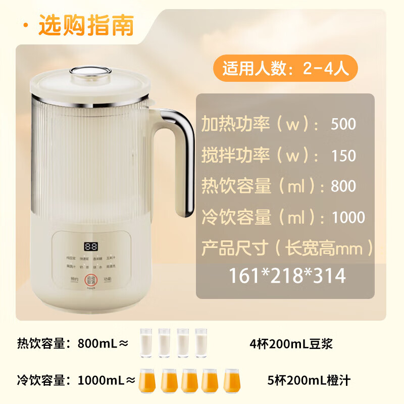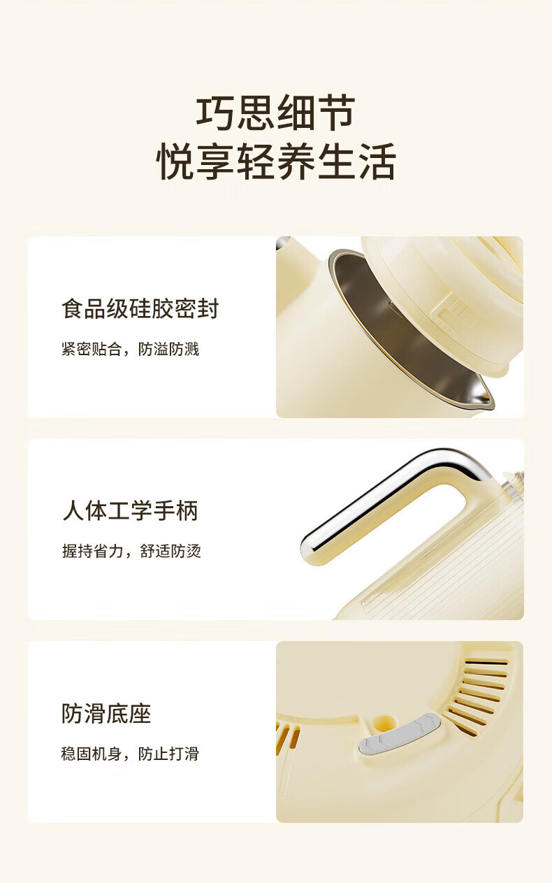 噪音低至45dB; 小巧不占地,簡易好拆裝; 22min特快漿; 細(xì)膩免濾,營養(yǎng)香濃; 雙口感可調(diào) 容量:1000mL 單臺包裝尺寸:245L*245W*400Hmm