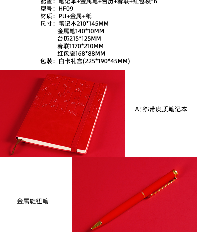 配置:筆記本+金屬筆+臺歷+春聯+紅包袋*6 型號:NF09 材質:PU+金屬+紙 尺寸:筆記本210*145mm 金屬筆140*10mm 臺歷215*125mm 春聯1170*210mm 紅包袋168*88mm 包裝:白卡禮盒(225*190*45mm)