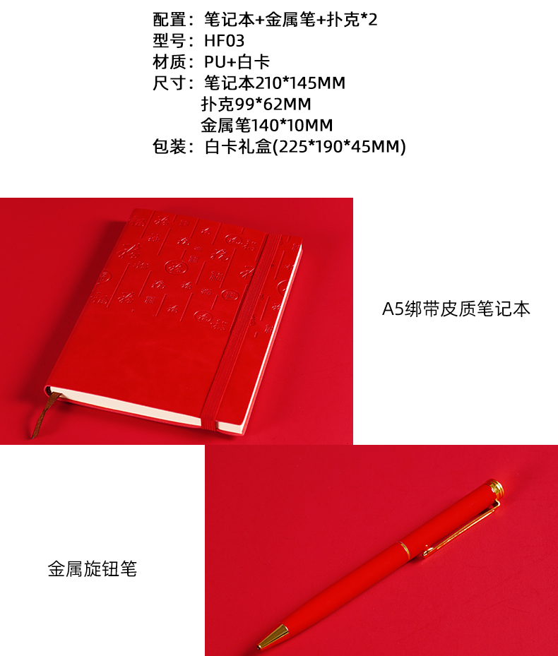配置:筆記本+金屬筆+撲克*2 型號:NF03 材質:PU+白卡 尺寸:筆記本210*145mm 撲克99*62mm 金屬筆140*10mm 包裝:白卡禮盒(225*190*45mm)