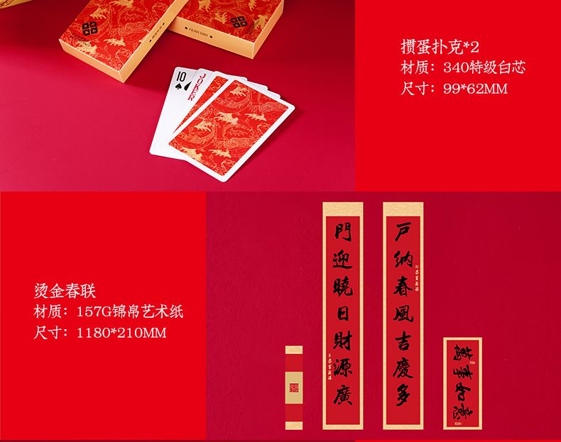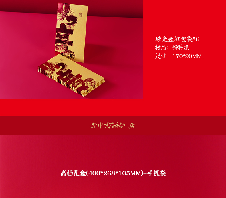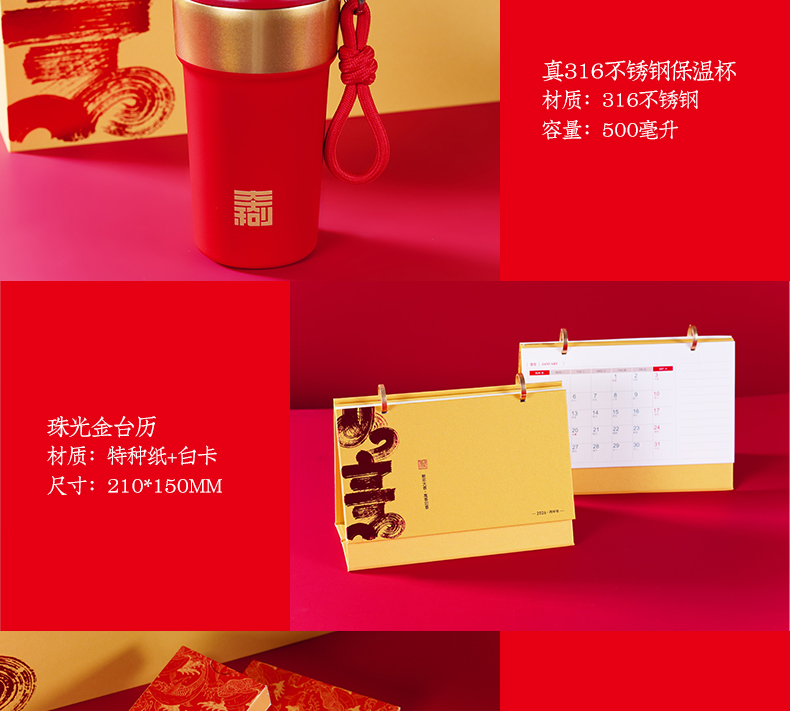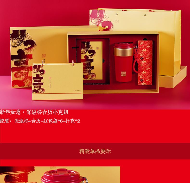 配置:保溫杯+臺歷+紅包袋*6+春聯 材質:珠光金紙+白卡+合金+316不銹鋼 尺寸:保溫杯500mL 臺歷210*150mm 春聯1180*210mm 紅包袋170*90mm 包裝:珠光金禮盒(400*268*105mm)+手提袋