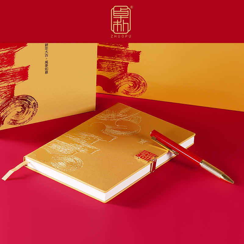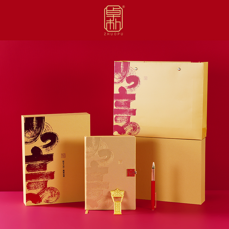 配置:筆記本+筆+冰箱貼 材質(zhì):珠光金紙+合金+珠光皮 尺寸:筆記本145*210mm 簽字筆138*11mm 冰箱貼80*40mm 包裝:珠光金禮盒(260*195*50mm)+手提袋